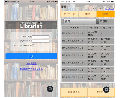 - 管理側は、書籍購入時の登録(ISBNによるバーコード登録が可能) や管理および借出申請承認、利用者登録、管理者登録が可能。